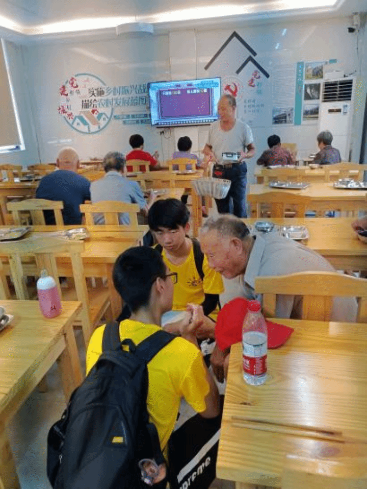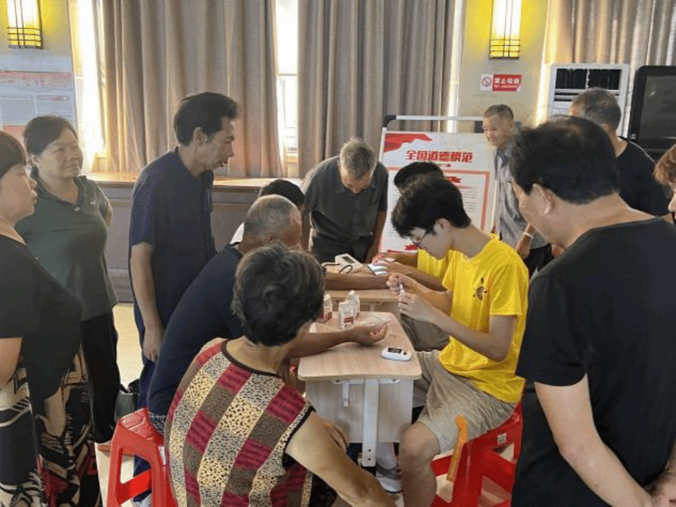 面对老年人最普遍的“三高”问题,实践团团员发挥自身学科优势,顶着烈日,穿梭于大元下村,每到一户老人家中,便为他们提供免费的血压、血糖测量,虽然双方存在一定的语言沟通障碍,但大爱无声,有爱无碍,从老人家们发自内心的微笑中,团员们深受鼓舞。