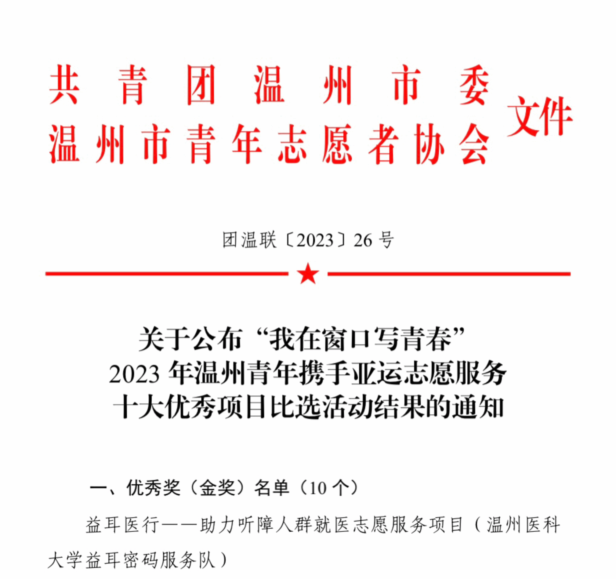 据悉,本次“我在窗口写青春”2023年温州青年携手亚运志愿服务十大优秀项目比选活动以深入贯彻党的二十大精神、习近平总书记关于志愿服务系列重要指示精神为出发点展开评比,大力挖掘、培育、推广优秀志愿服务项目,引导青年志愿服务组织和广大青年志愿者为深入实施“八八战略”,以“两个先行”打造“重要窗口”,奋力续写中国式现代化温州篇章贡献力量。经过项目申报、条件审查、入围初评、路演终评,评选出 10 个项目优秀奖(金奖),12 个项目提名奖(银奖)。