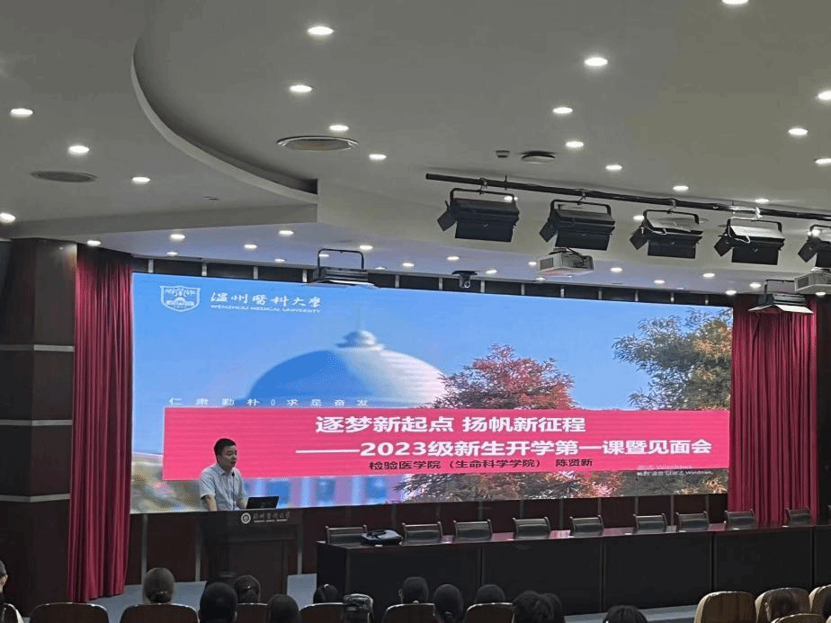 在旭光厅开展2023级新生开学第一课暨见面会。学院党委副书记陈贤新为2023级新生讲授“开学第一课”,2023级全体新生参会。