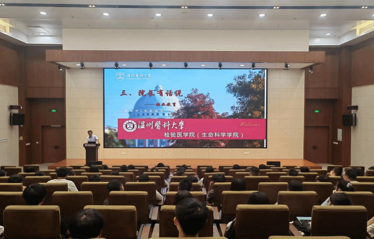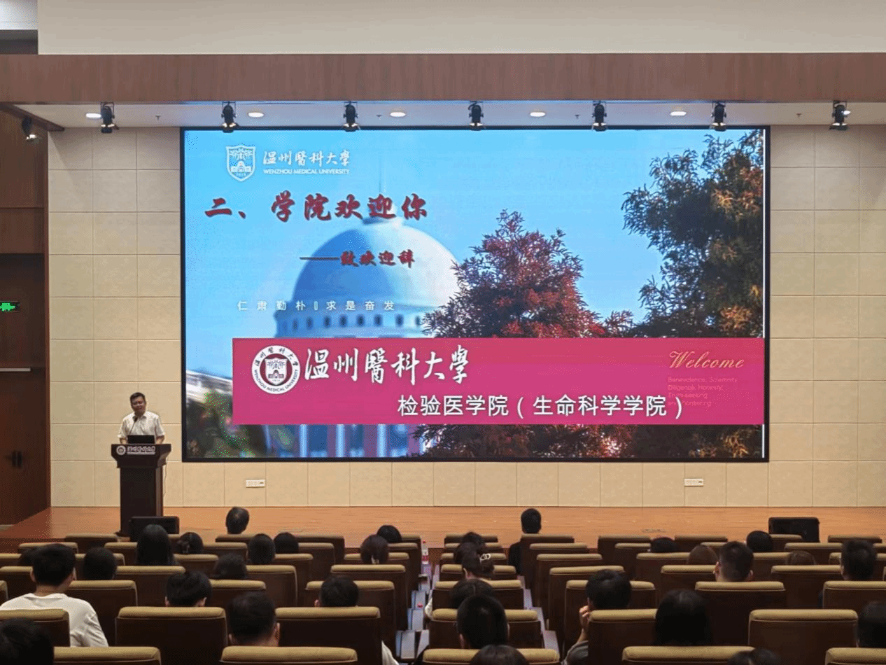 于生物医药科研楼学术报告厅开展研究生始业教育。执行院长郑晓群、党委副书记陈贤新、副院长黄海山、学研办主任林虹、新生辅导员黄小彪以及2023级133位新生共同参与了此次活动。