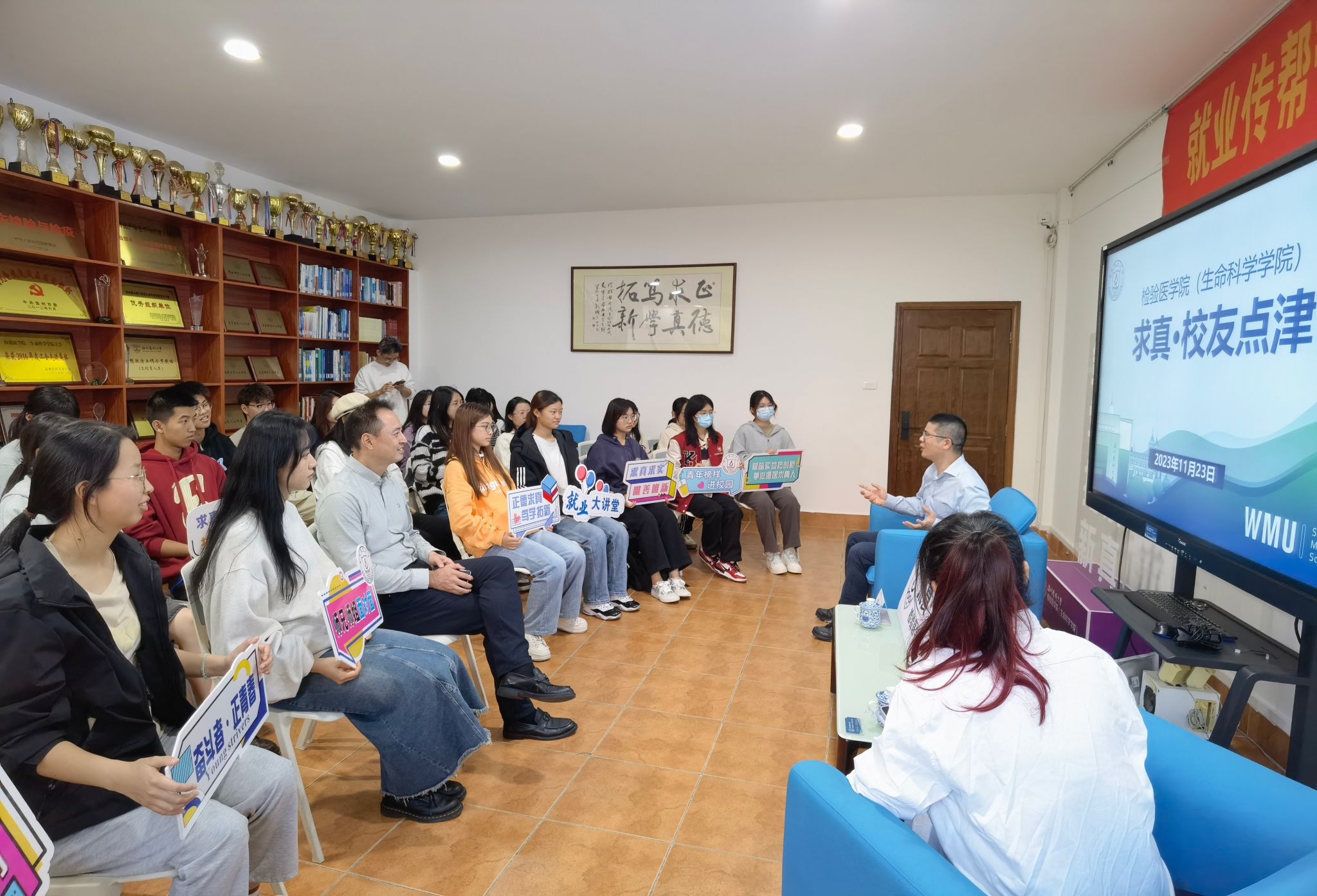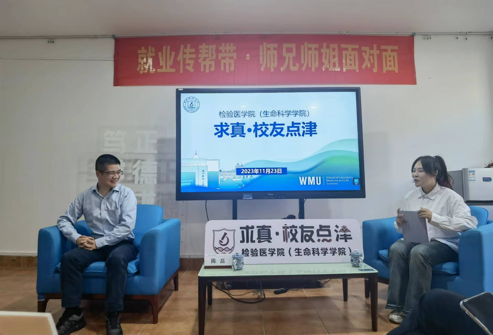 于11月23日下午举办“求真·校友点津”分享会,此次活动特邀1998级医学检验专业校友、杭州吉创生物科技有限公司创始人陈磊主讲,学院副院长楼哲丰和师生代表参与活动。