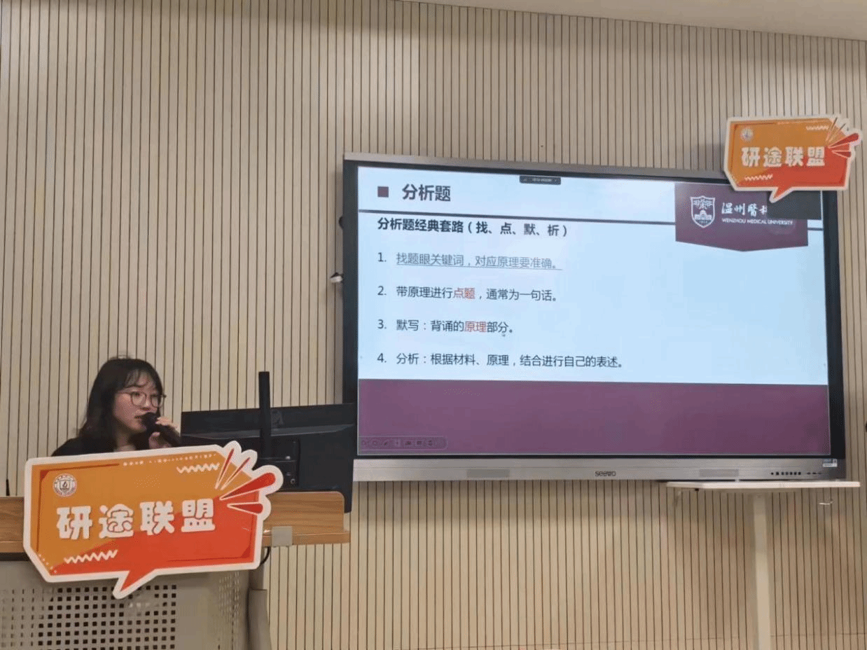 教师苏程和研究生魏思琪为同学们作考研政治指导交流。苏程老师从考试范围与题型引入,指出大家在冲刺阶段应做什么,并提出复习时采取结合关键词列简要大纲整理知识点,并就简答题、选择题、分析题给出了相应的答题建议。同时,魏思琪也分享了自己的政治高分经验,对于各个题型都给出了针对性建议和方法,如排除法、辨别干扰项、找题眼等,强调要保持题感,按照逻辑集中背诵。