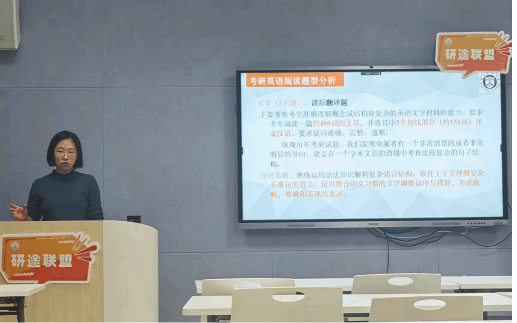 11月29日的考研英语阅读与翻译讲座中,林甜甜老师首先就《2024年全国硕士研究生招生考试英语大纲》进行解读,指出考生对单词不能只是死记硬背,更应有单词的生成知识和语境意识,应该了解题源并掌握主题。她为同学们指明翻译的三大难点:词汇认知、语法逻辑和语言表达,同时也结合实际案例给大家提供了功能对等法、划分拆解法、先找主干后找从句、巧用非谓语动词结构等实用的翻译技巧。最后,林老师对翻译模块进行了总结,那就是单词方面要背到5500以上且掌握一词多义;先找主句,后找从句和非谓语结构;译文表达要地道,语言能力要跟上。