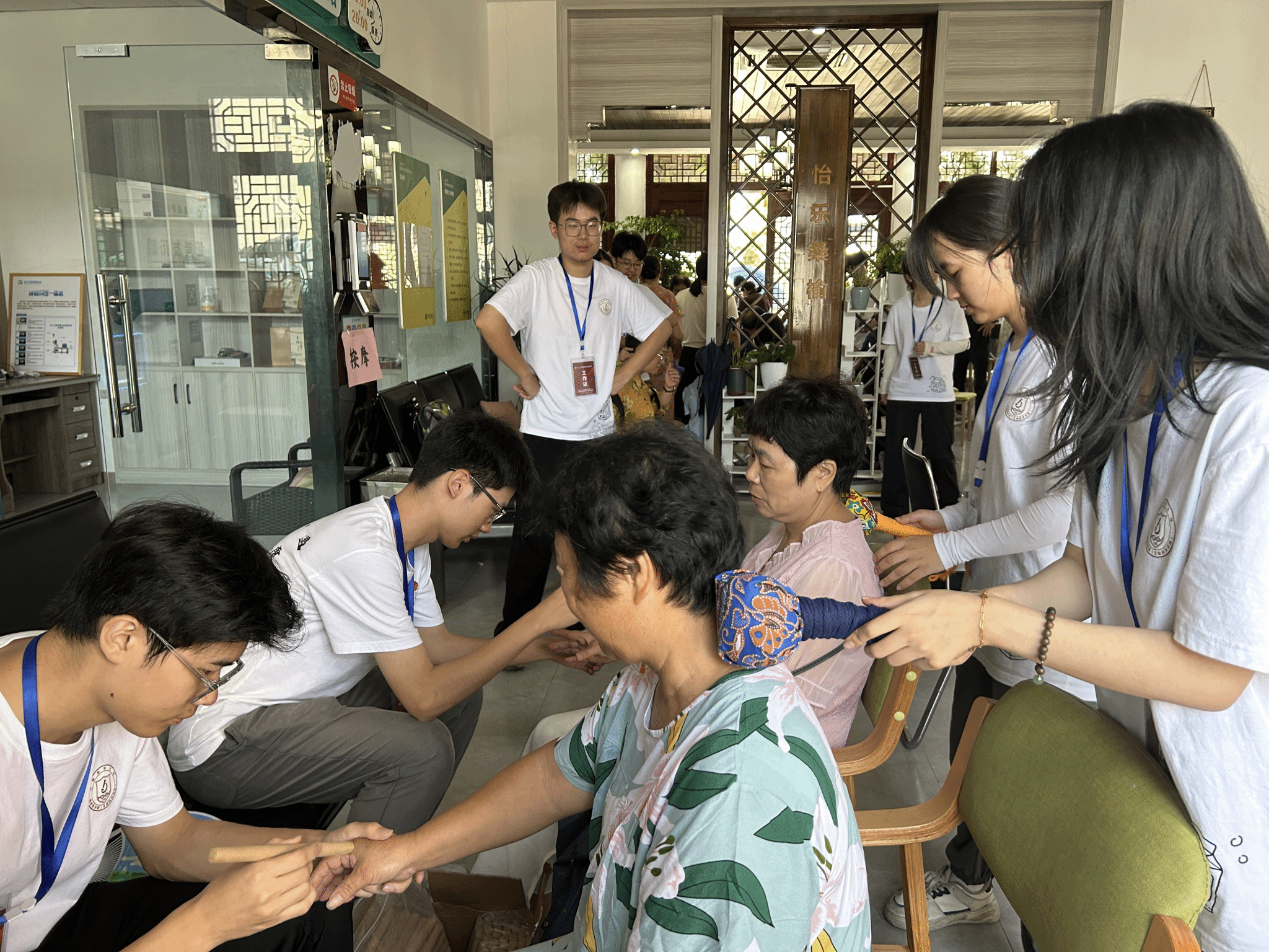 在实践团成员的陪同下,余信丰副书记一行参观并体验实践团开展的系列爱心义诊活动。实践团成员们熟练的操作和良好的服务态度得到了村民的一致认可和赞许。同时,实践团邀请麻豆社