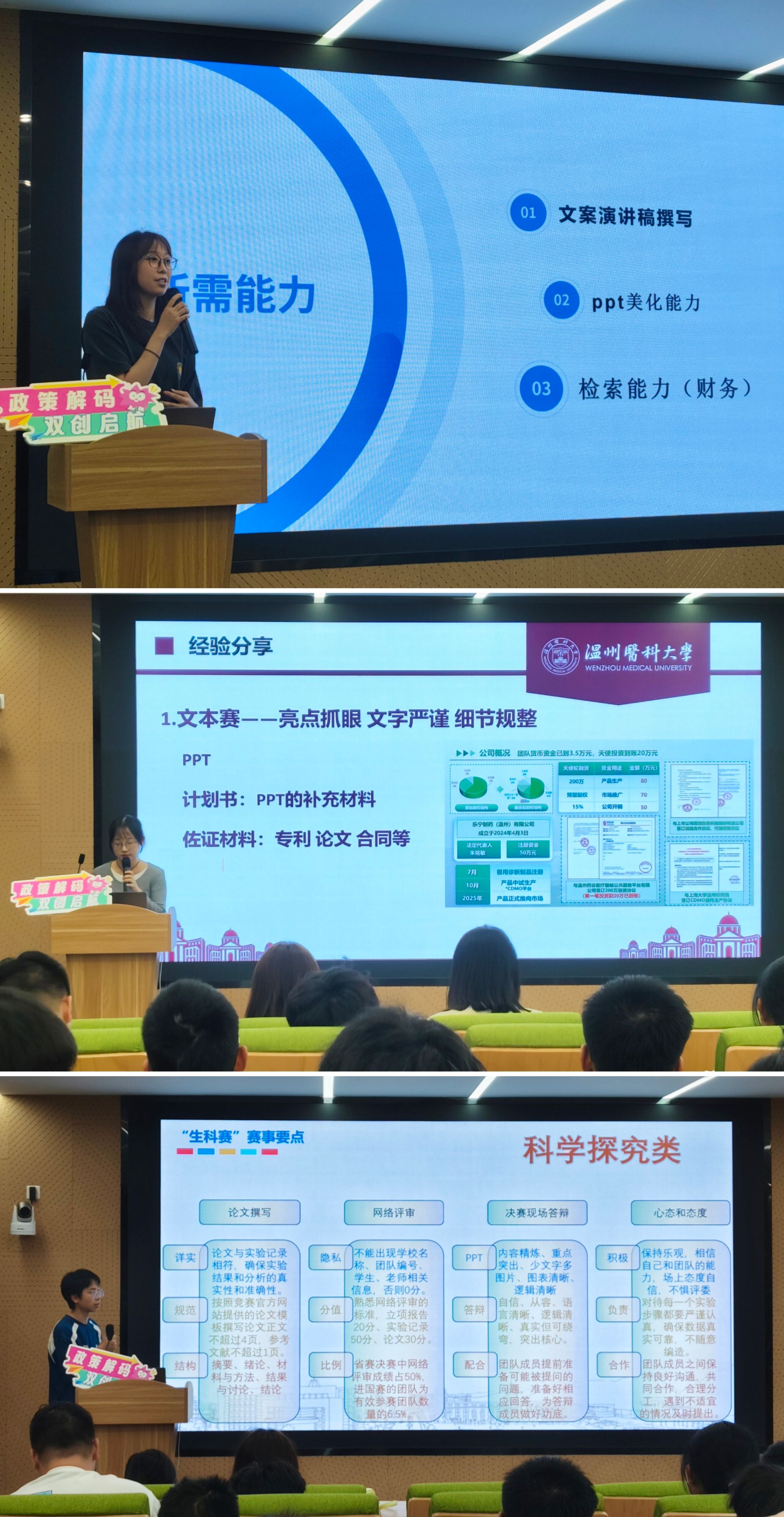 随后,罗添齐同学分享了在中国国际大学生创新大赛中的备赛经验,以及组建团队需要具备的知识和技能素养;朱铭敏同学分享了参加“挑战杯”的经验,详细阐述了关于“挑战杯”赛道的抉择过程,以及自己团队在赛道转换上的考量;陈帝仲同学详述了生科赛的两个赛道,并分享了参与不同赛道的经历与时间安排。三位同学结合自身团队实例,细致讲解了备赛过程及要点。讲座现场气氛活跃,同学们提出了许多相关问题,积极与嘉宾互动。