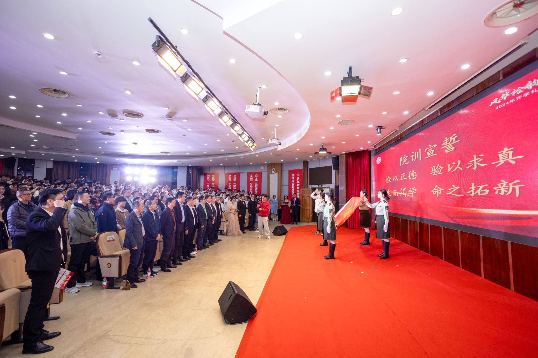 师生面对着院旗,庄严宣誓:检以正德,验以求真;生而笃学,命之拓新。铿锵有力的誓言勉励全体师生坚守初心,同心谱写新华章。