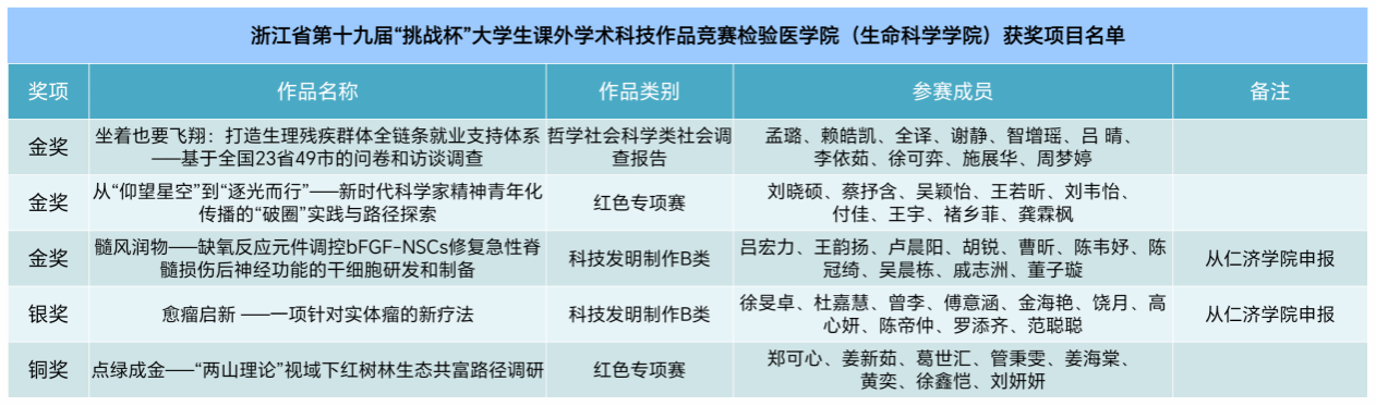 据悉,浙江省第十九届“挑战杯”大学生课外学术科技作品竞赛由共青团浙江省委、浙江省教育厅、浙江省社会科学院、浙江省科学技术协会和浙江省学生联合会联合主办,浙江中医药大学承办。自大赛启动以来,全省共有103所高校参赛,遴选推荐2057件作品参加省级复赛。最终本届大赛评选产生金奖273项,其中主体赛208项、“红色专项赛”65项。