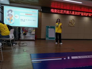 阳光志愿者服务社及益耳密码志愿服务队志愿者走进梅泉社区,开展儿童友好“益耳护耳”公益志愿活动,向小朋友们科普护耳知识和常用手语。