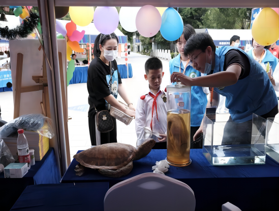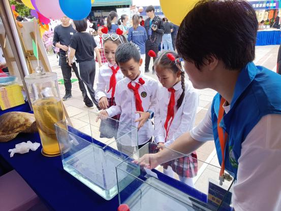 在活动现场,志愿者们通过对多种海螺标本、海龟标本、斑马鱼的生动讲解,向孩子们展示了美丽的海洋世界,同时讲解海洋与人类健康的密切关系,志愿者还引导孩子们画出自己心中美丽的海洋,进一步激发出孩子们对海洋的兴趣和热爱,唤醒孩子们保护海洋的环保意识。