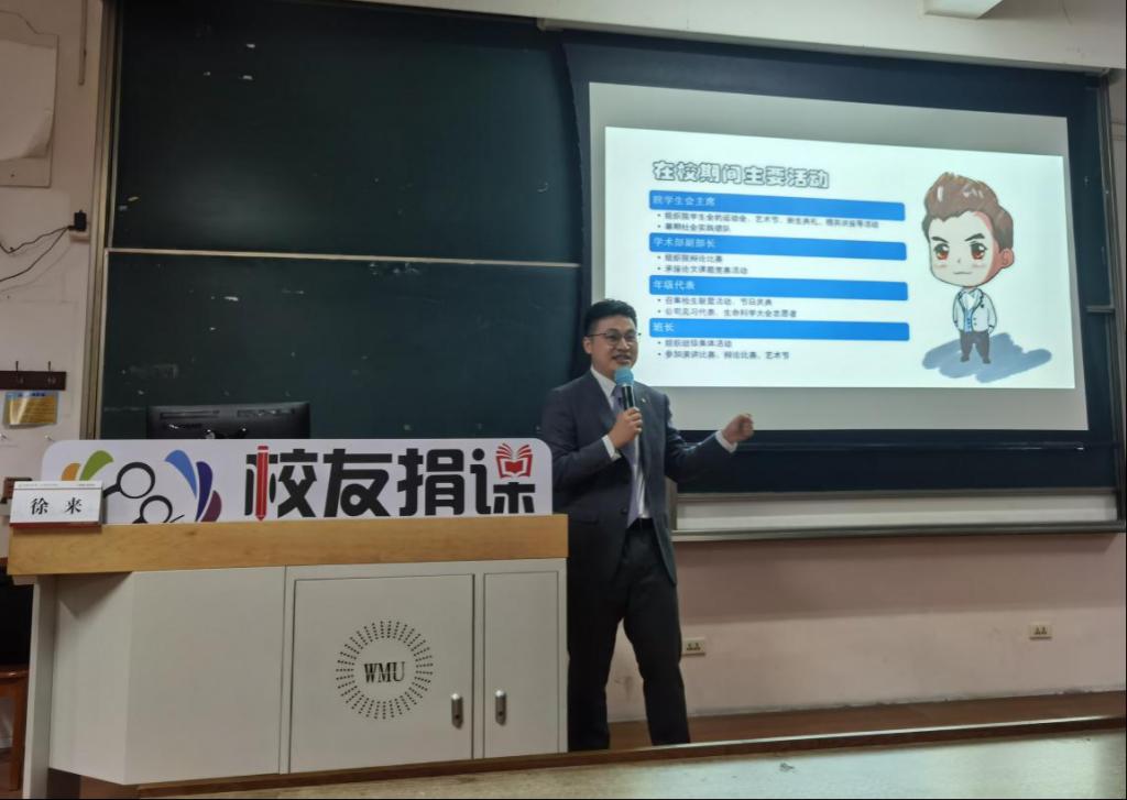 徐来以自身成长为例,分享了在校学习经历、职业发展历程、职业岗位需求、提前规划职业、创业就业思考等五方面内容,他结合自身经历为在场学生详细介绍了医院与企业、国内企业与外资企业在未来发展、工作环境、岗位需求等方面的不同点,从而强调职业规划的必要性和前瞻性。他建议学弟学妹们充分利用在校时光,在学习中孜孜不倦,在生活中知足常乐,在工作中团结互助,在前进的道路上保持好奇心,要相信未来一定光明美好。