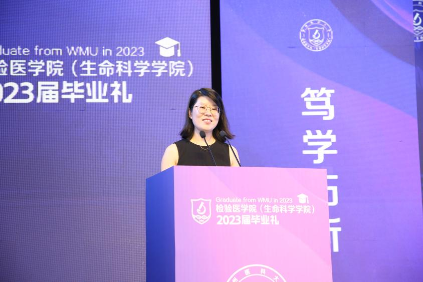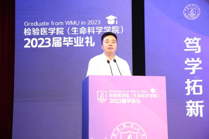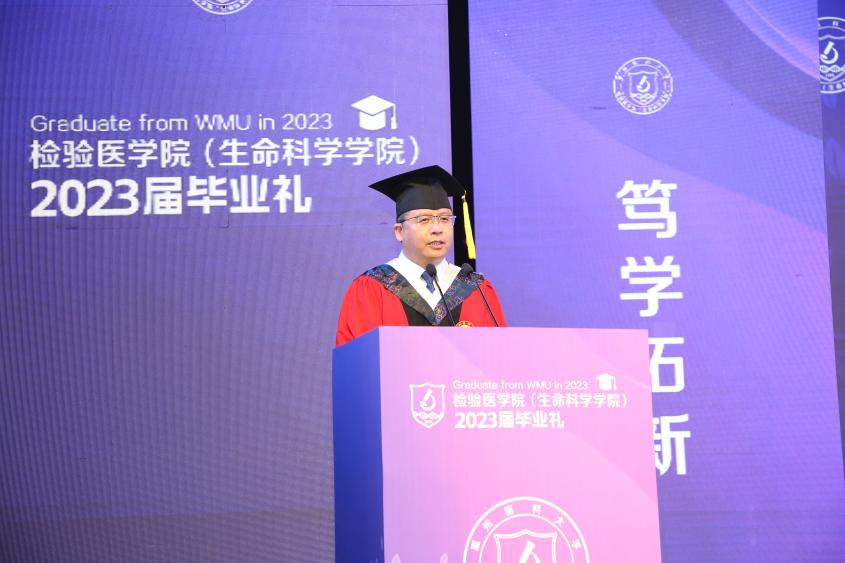 执行院长郑晓群做毕业典礼致辞,他代表学院向2023届毕业生们送上诚挚的祝贺和美好的祝福,回顾了本届毕业生在校学习的特殊经历和成长历程,肯定了毕业生们在学习、科研、实践等方面取得的优异成绩,希望毕业生们心怀家国,志存天下;勤学善思,笃行致远;风雨无惧,勇毅前行;心存感恩,传承大爱,祝愿“最年轻的校友们”从温医大出发,以梦想为伴,与时代同行,一起阔步向未来!