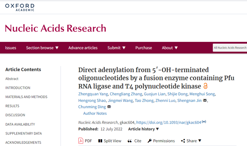 丁春明和金胜男科研团队博士后杨政权在国际著名刊物Nucleic Acids Research上发表题为《Direct adenylation from 5′-OH-terminated oligonucleotides by a fusion enzyme containing Pfu RNA ligase and T4 polynucleotide kinase》的研究论文。该研究筛选和鉴定了一种新型热稳定腺苷酰化酶,并在此基础上开发了一种具有磷酸化与腺苷酰化活性的双功能酶,首次实现了对羟基末端DNA底物的酶法直接腺苷酰化催化。