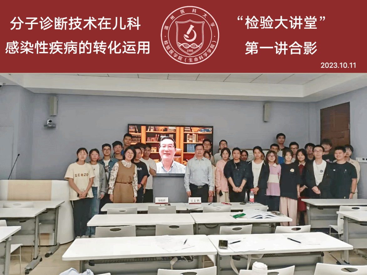 10月11日晚上,本学期第一场“检验大讲堂”系列讲座在茶山校区同济楼智慧教室 6A303举行。浙江大学医学院附属儿童医院实验检验中心名誉主任、浙江省基因诊断中心副主任尚世强教授与2022 级临床医学(检验医师培养试验班)的同学们深入交流,就转化医学的重点、分子诊断技术在儿童感染性疾病中的转化应用和转化中遇到的问题等方面进行了讨论。本次活动由郑晓群教授主持。