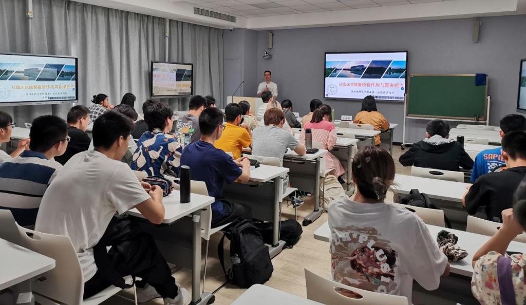 附属第一医院感染内科主任、中国研究型医院学会肝病专业委员会常委卢明芹教授与2022 级临床医学(检验医师培养试验班)的同学们深入交流,就检验作用、医学和人文本质以及执业医师基础等方面进行了讨论。本次活动由学院执行院长郑晓群教授主持。