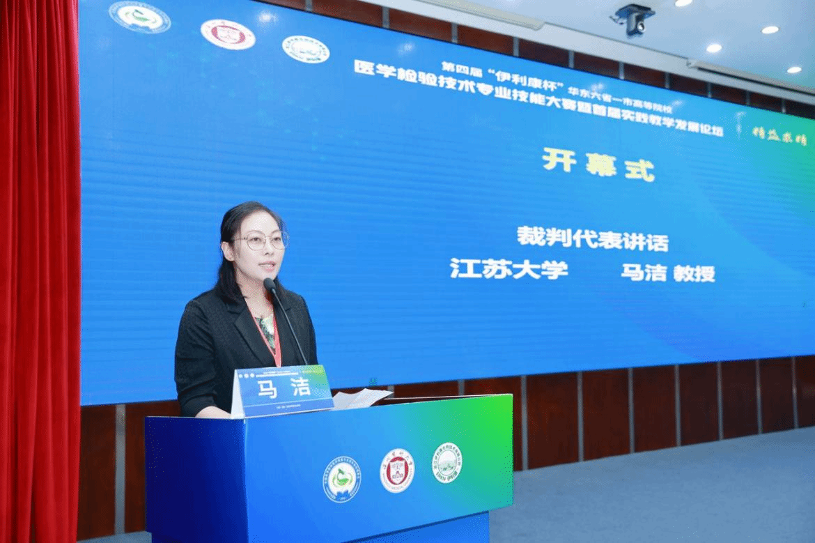 裁判代表马洁教授发言,她说本次技能大赛不仅是对医学检验技术专业实践教学的检验,也是华东地区高等院校之间相互交流的重要活动。为保证本次大赛公平公正,她代表全体裁判员向大会组委会和各参赛队表示决心,将服从大赛组委会的统一安排,严格执行本次比赛的各项规程,遵守比赛纪律,认真履行裁判员职责,坚持公平、公正、公开的原则,尊重选手,尊重事实,公正裁决,绝不徇私舞弊,确保本次大赛的公平性和严肃性。