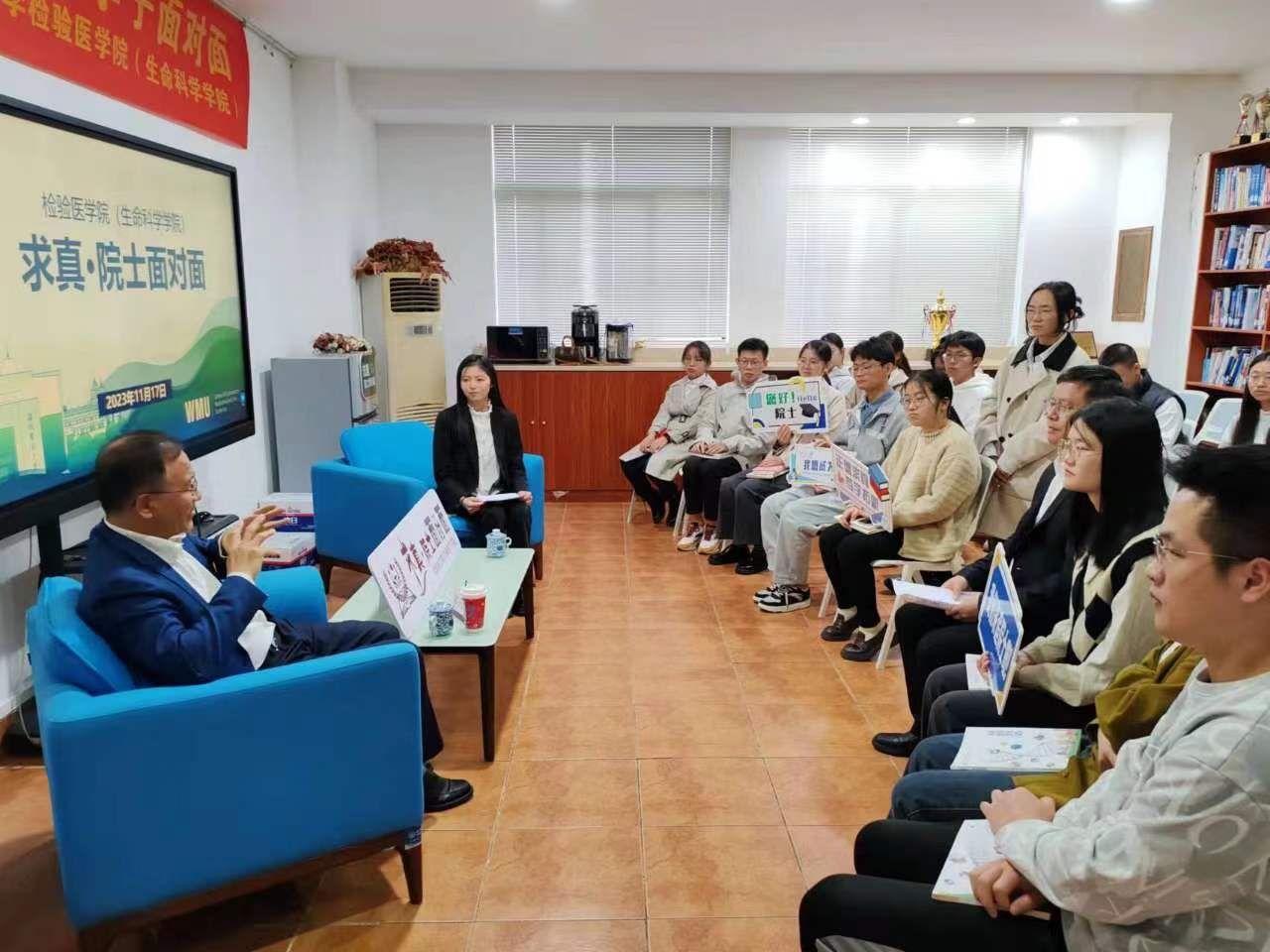 邀请中国科学院邓子新院士与青年学子开展“面对面”交流,学院执行院长郑晓群、学生工作办公室和学位与研究生工作办公室相关人员、本科生和研究生代表参加交流会。