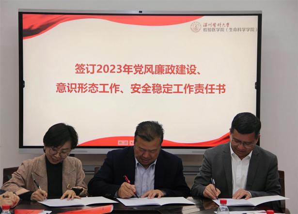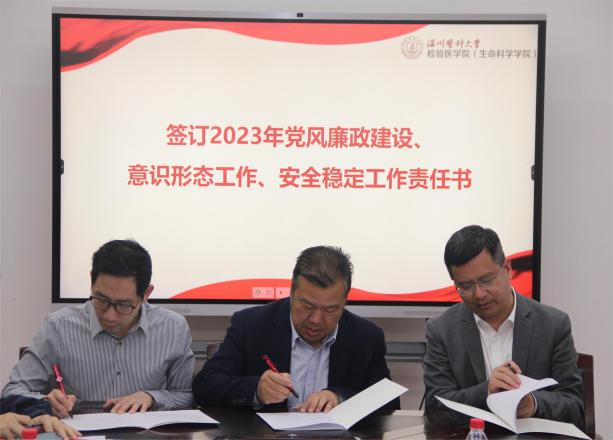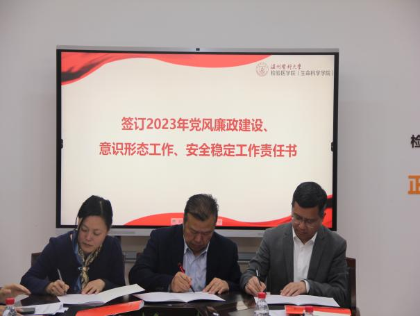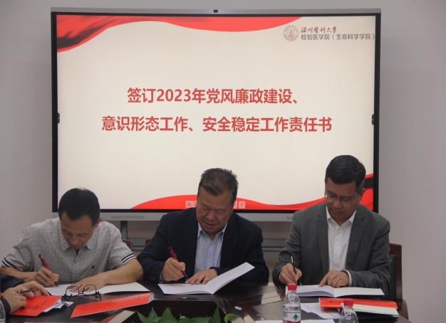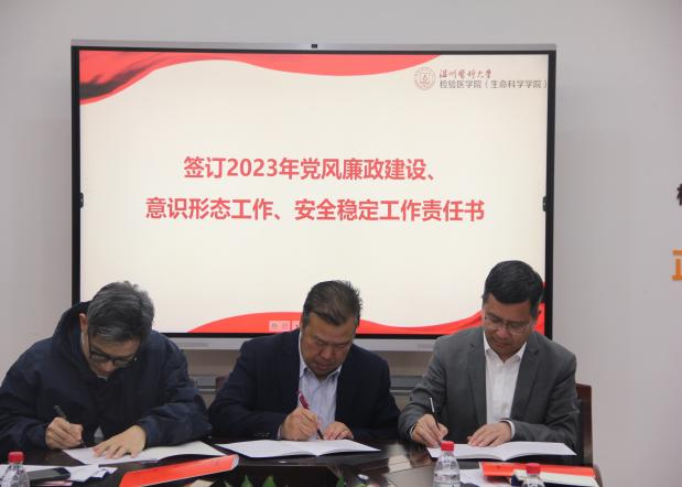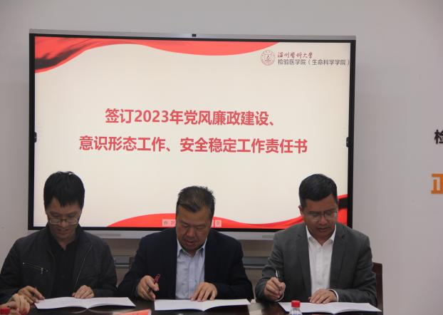 会议集体观看警示教育片《永远吹冲锋号》,学院党委与领导班子成员、各系、科室、中心负责人和党支部负责人签订2023年党风廉政建设、意识形态工作、安全稳定工作责任书。