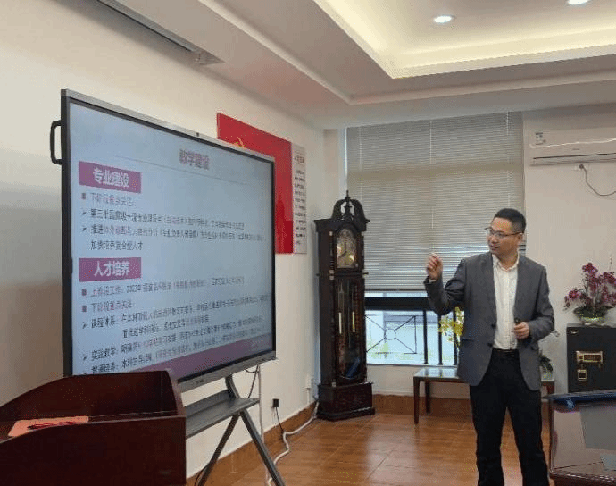 省级教学成果奖申报、专业建设、教学资源情况、实践教学建设、创新创业工作、师资队伍建设、本科教学评估准备等几个方面做了详细介绍。洪晓畅书记表示,学院的人才培育质量应从宏观的视角对教学工作进行回溯,学院将着力抓好人工智能赋能教学,进一步关注人才的创新培养。