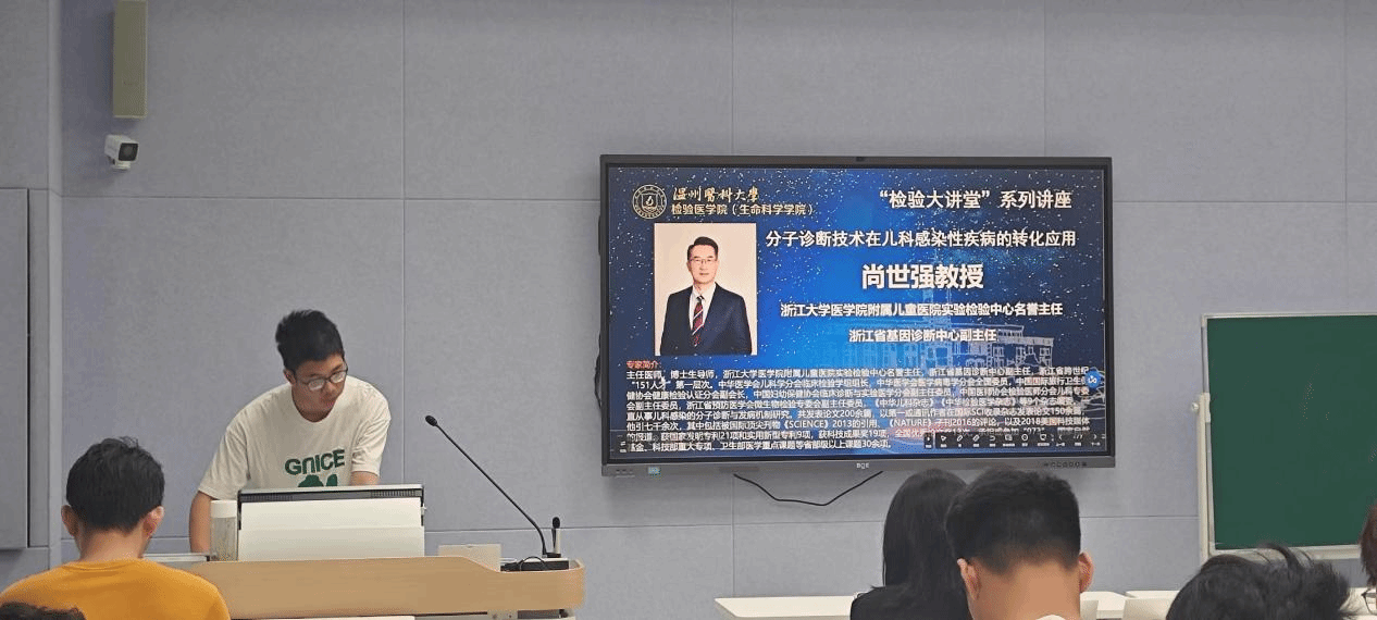 近日,本学期第二场“检验大讲堂”系列讲座在6B206举行。浙江大学医学院附属儿童医院实验检验中心名誉主任、浙江省基因诊断中心副主任尚世强教授围绕转化医学的重点、分子诊断技术在儿童感染性疾病中的转化应用和转化中遇到的问题内容作精彩讲座。本次活动由王省淦同学主持,2023级、2024级临床医学(检验医师培养试验班)同学参加,2023级班主任周燕老师出席。