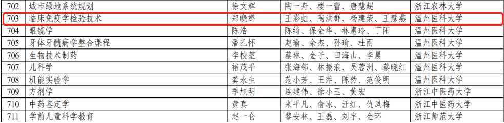 执行院长郑晓群主持建设的《临床免疫学检验技术》成功入选国家级线上线下混合式一流课程、教学副院长关万春主持建设的《卫生检验检疫》成功入选国家级线下一流课程。